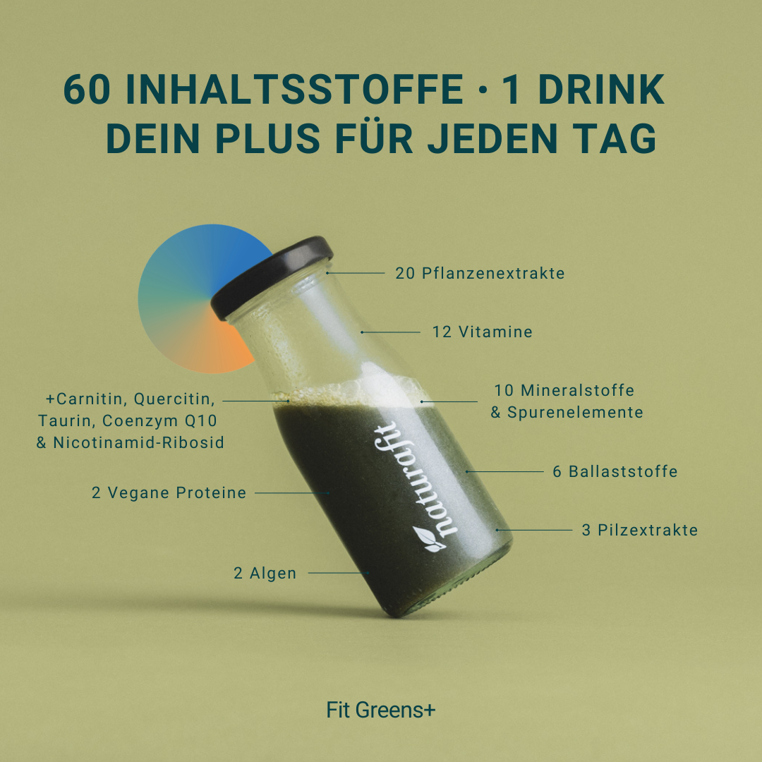 FIT GREENS+ unterstützt durch eine Kombination aus über 60 Inhaltsstoffen gezielt verschiedene Körperfunktionen. Es trägt zu einer normalen Funktion des Immunsystems bei (Vitamine A, C, D und Zink), unterstützt den Energiestoffwechsel (Eisen, B3, Magnesium) und fördert die kognitive Funktion sowie die psychische Gesundheit (Vitamine B2, B12, C und Folat). Zudem unterstützt es den Erhalt von normaler Haut und Haaren sowie das Nervensystem.