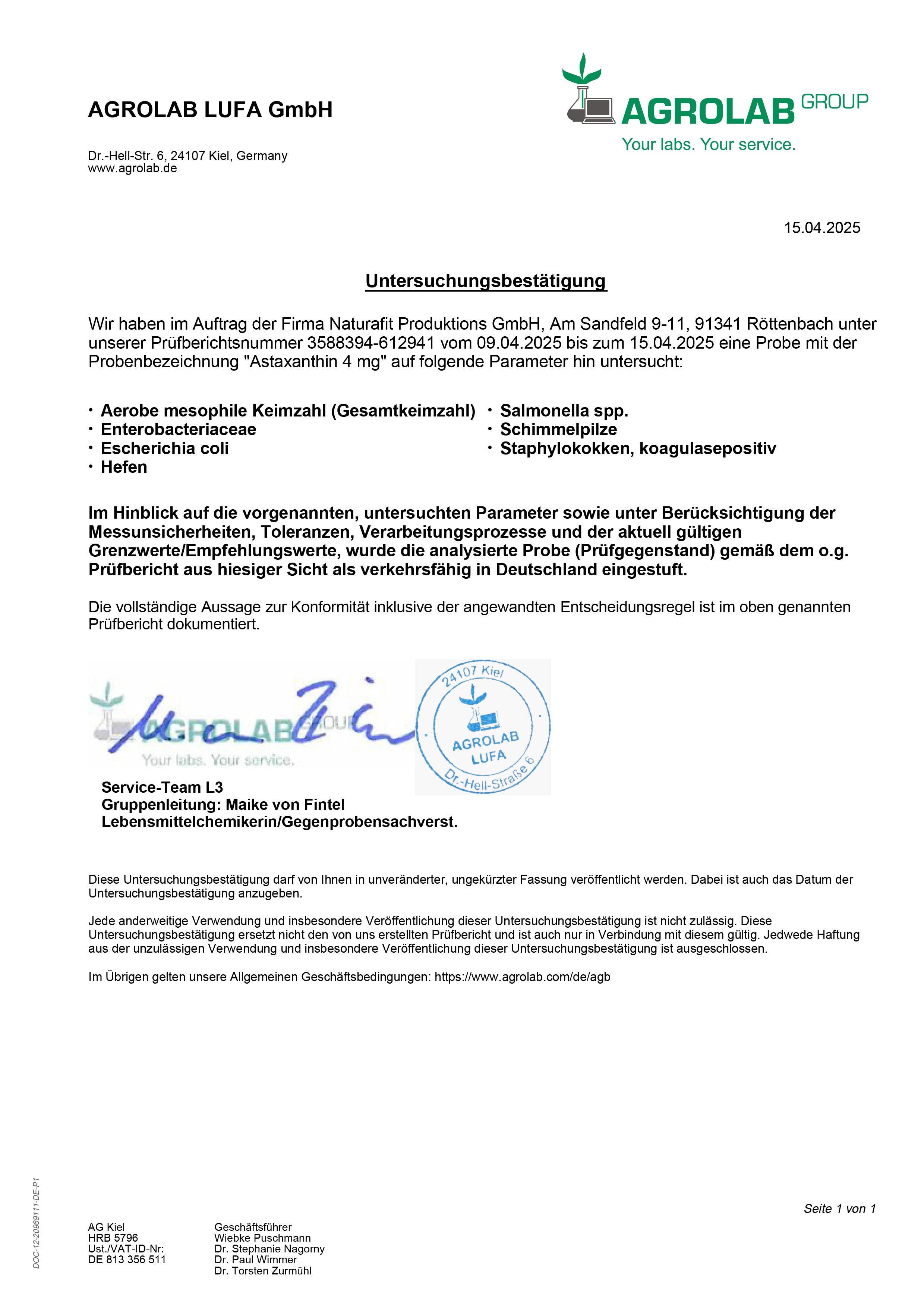 Astaxanthin natürlich, Füllstoff Cellulose, Überzugsmittel Hydroxypropylmethylcellulose (Kapselhülle), Antioxidationsmittel Ascorbylpalmitat:Das natürliche Astaxanthin wird aus der Mikroalge Haematococcus pluvialis gewonnen. Auftretende Farbvarianzen der Kapsel sind möglich und natürlichen Ursprungs.