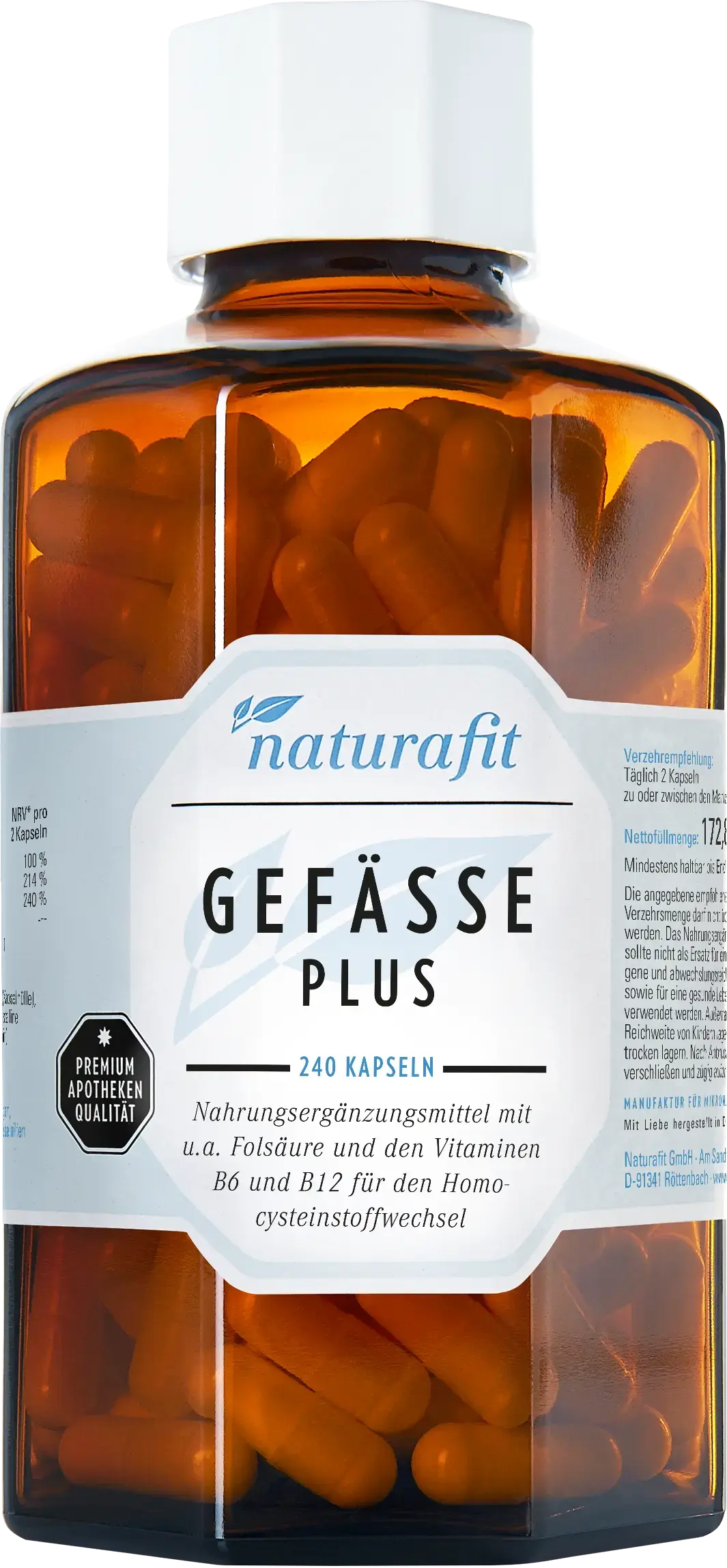 Unser Nahrungsergänzungsmittel für die Gefäße zeichnet sich durch die enthaltenen Mikronährstoffe für den Homocysteinstoffwechsel aus. Homocystein ist eine Aminosäure, die beim Eiweißstoffwechsel gebildet wird und sich in den Gefäßen ablagern kann.Die im Produkt enthaltenen Substanzen Folsäure, Vitamin B6 und Vitamin B12 tragen zu einem normalen Homocystein-Stoffwechsel bei.¹Ergänzt werden diese Stoffe durch die Aminosäure Arginin, die einen positiven Einfluss auf die Gefäße hat. naturafit Gefässe Plus wird ohne den Einsatz von Rieselhilfen wie Magnesiumstearat, Siliciumdioxid und Talkum hergestellt.